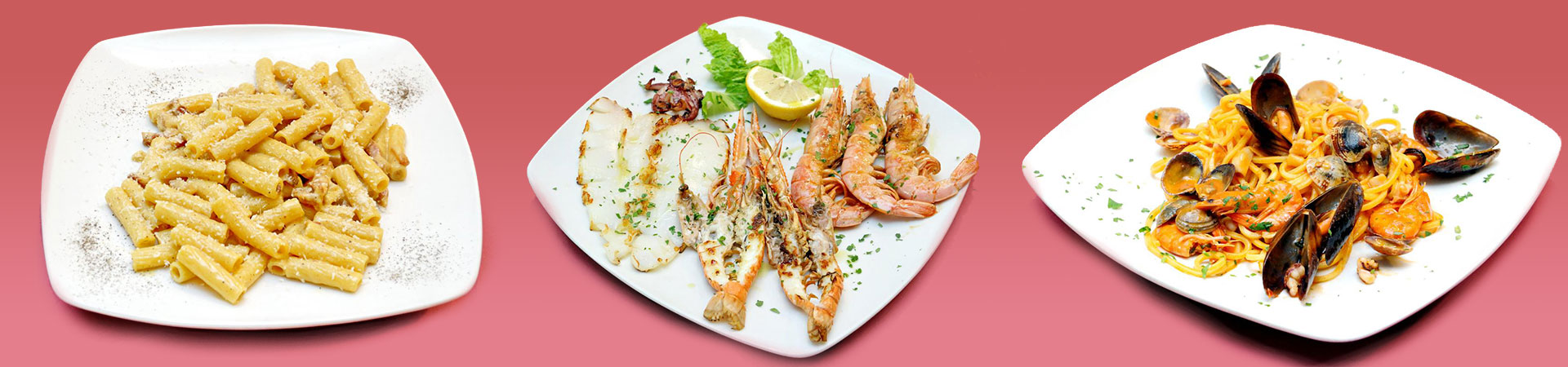 Tonnarelli con calamaretti, zucchine, pomodori secchi, gamberi rosa e crumble di taralli al pepe € 16,00